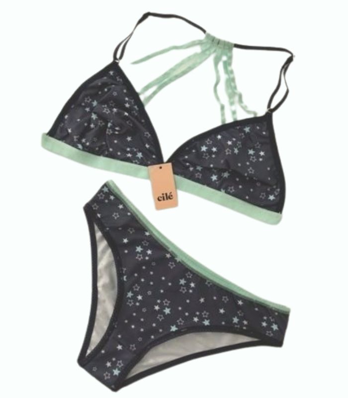 Conjunto sostén triángulo con detalle en espalda y vedetina, de microfibra sublimada.